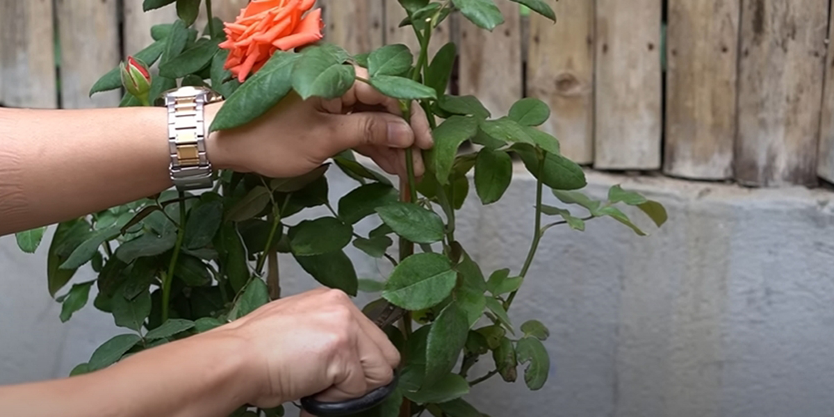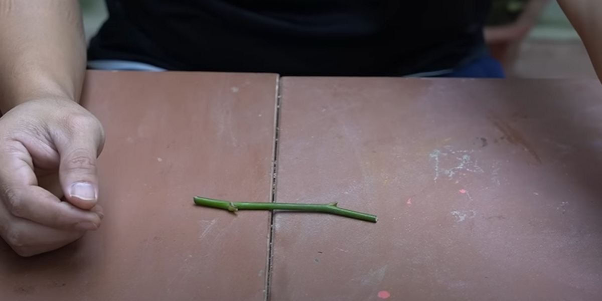 1. Cut the rose branch from the bush you would like to propagate. Remove all the leaves and keep only a portion with two buds.