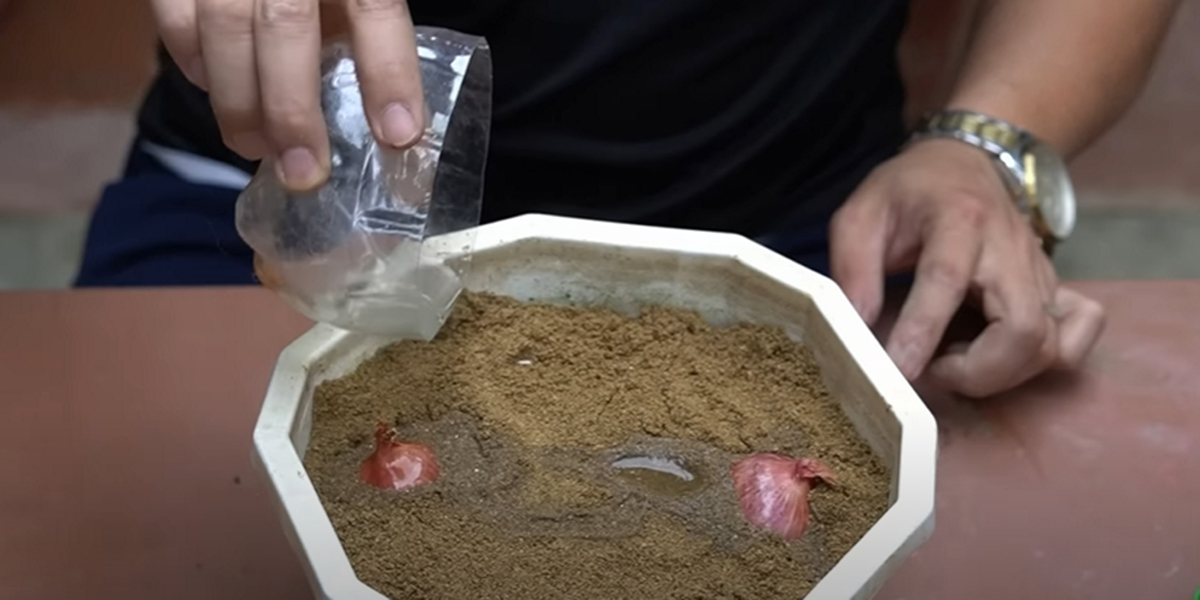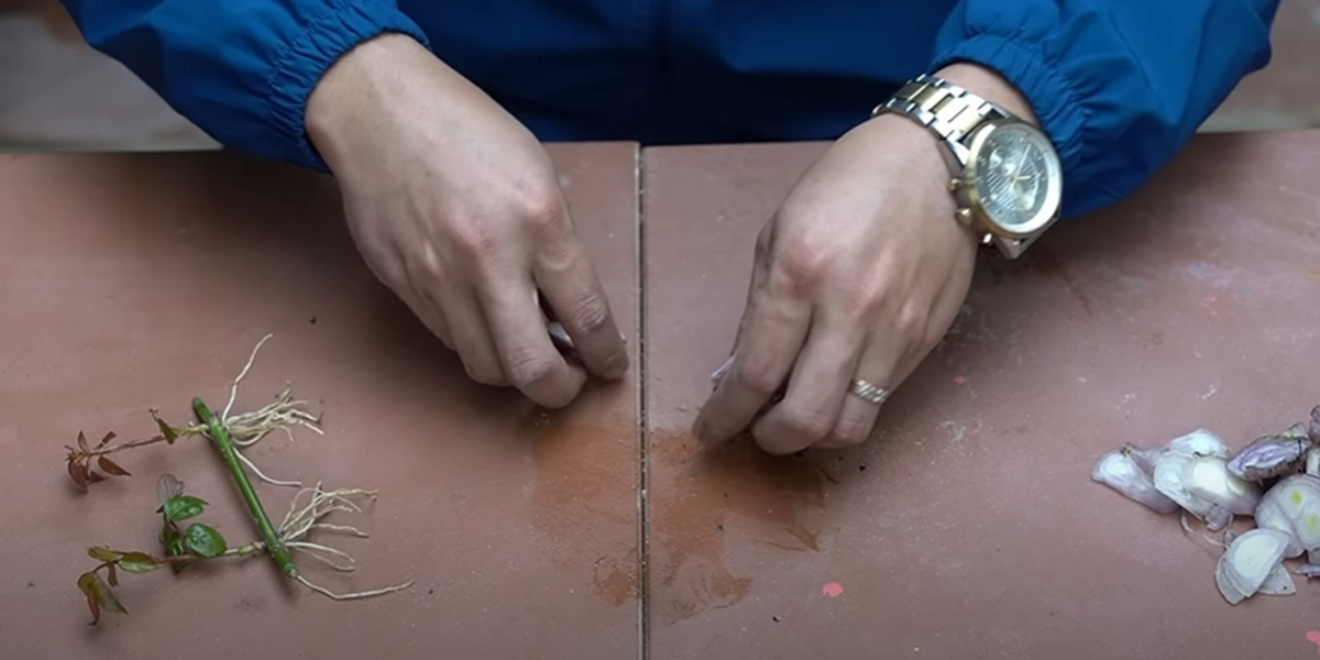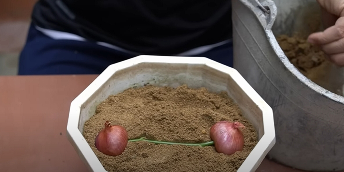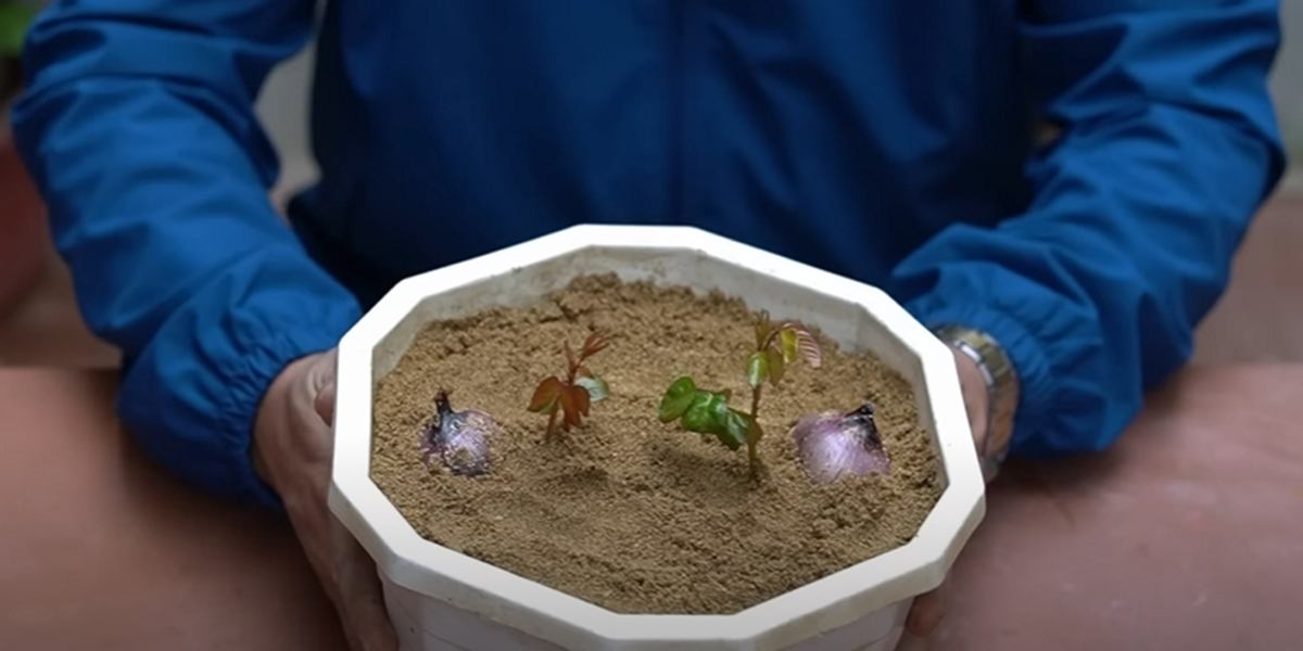 5. Remove the cutting from the sand and cut the onions into slices. Mix them with the soil in which you will plant the rose.