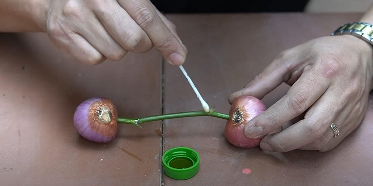 2. Stick the ends of the cutting into two small red onions and brush the buds with honey.
